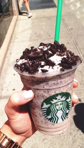 Este frappuccino con base de crema lleva dos cucharadas de helado de vainilla, chispas de chocolate, galletas oreo tanto para la decoración como dentro el batido, leche, salsa de chocolate y crema batida en la parte superior.