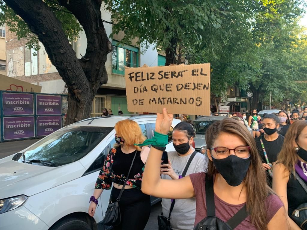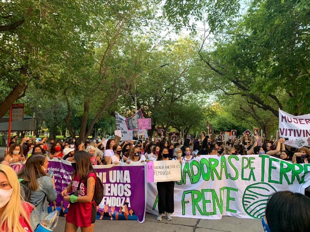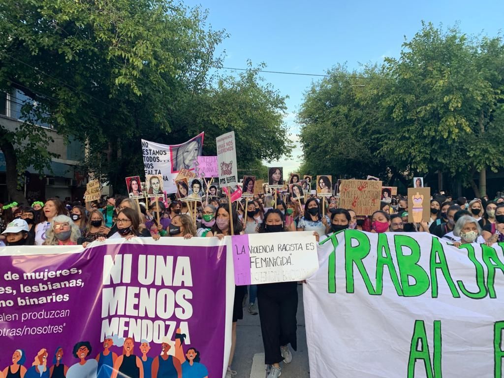Miles de mujeres mendocinas, entre ellas familiares de víctimas de femicidios, marchan por las calles de la Ciudad de Mendoza, de manera pacífica. El numeroso grupo se trasladó desde el nudo vial hasta el Poder Judicial, en el Parque Cívico, y luego hasta la Plaza independencia.