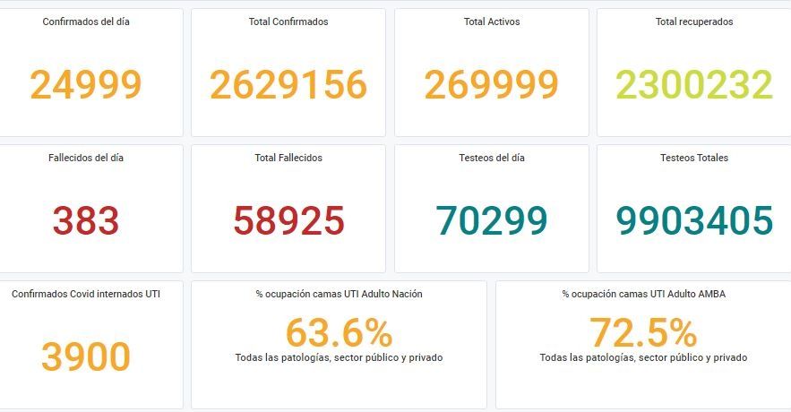 Argentina registró este jueves 24.999 nuevos casos de coronavirus, de acuerdo a la información brindada por el Ministerio de Salud de la Nación. Además, se produjo un nuevo récord de muertes en el año, con 383 nuevos fallecidos.