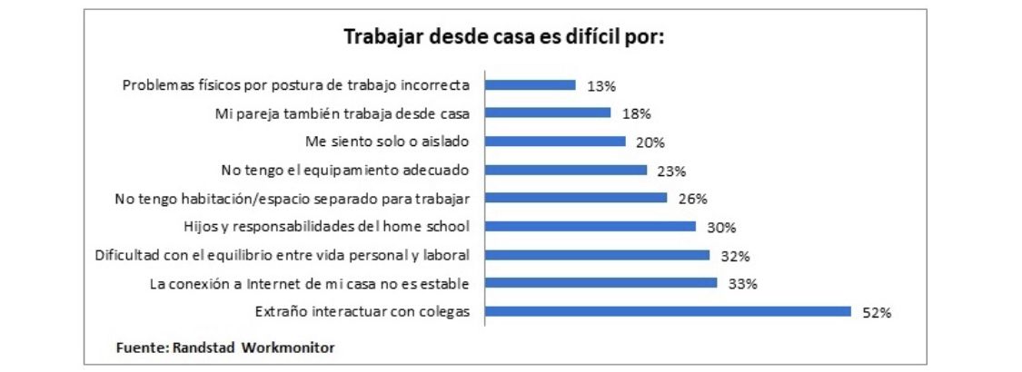 Otros motivos por los cuáles resulta difícil trabajar desde casa señalados por los participantes de la encuesta son: contar con una conexión inestable a internet (33%); la dificultad para mantener el equilibrio entre vida personal y laboral (32%); el home school de los hijos y la sobrecarga de tareas que esto conlleva (30%); no contar con un espacio separado para trabajar (26%); no tener el equipamiento adecuado (23%); sentirse solo o aislado (20%); trabajar en casa también con la pareja (18%); tener problemas físicos debido a una postura de trabajo incorrecta (13%).