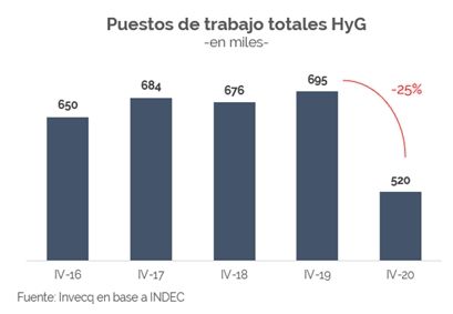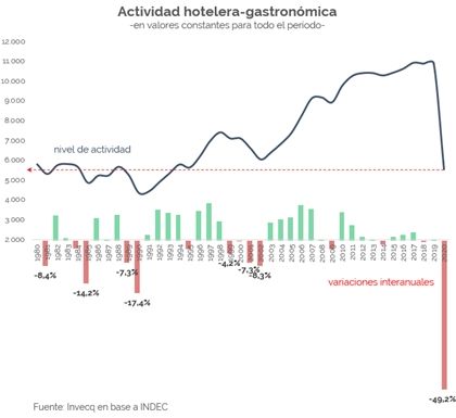 Según el informe elaborado por Invecq Consultora Económica, el nivel de actividad de la hotelería y la gastronomía retrocedió a valores similares a los de hace 40 años. Considerando solamente el período abril-diciembre 2020 (con la cuarentena ya iniciada) la caída en la actividad del sector fue del -62,3%. En enero del 2021 la actividad sectorial seguía estando -39% por debajo del mismo mes del año anterior, lo que indica que la flexibilización parcial de la actividad desde septiembre 2020 no generó un nivel de actividad normal.