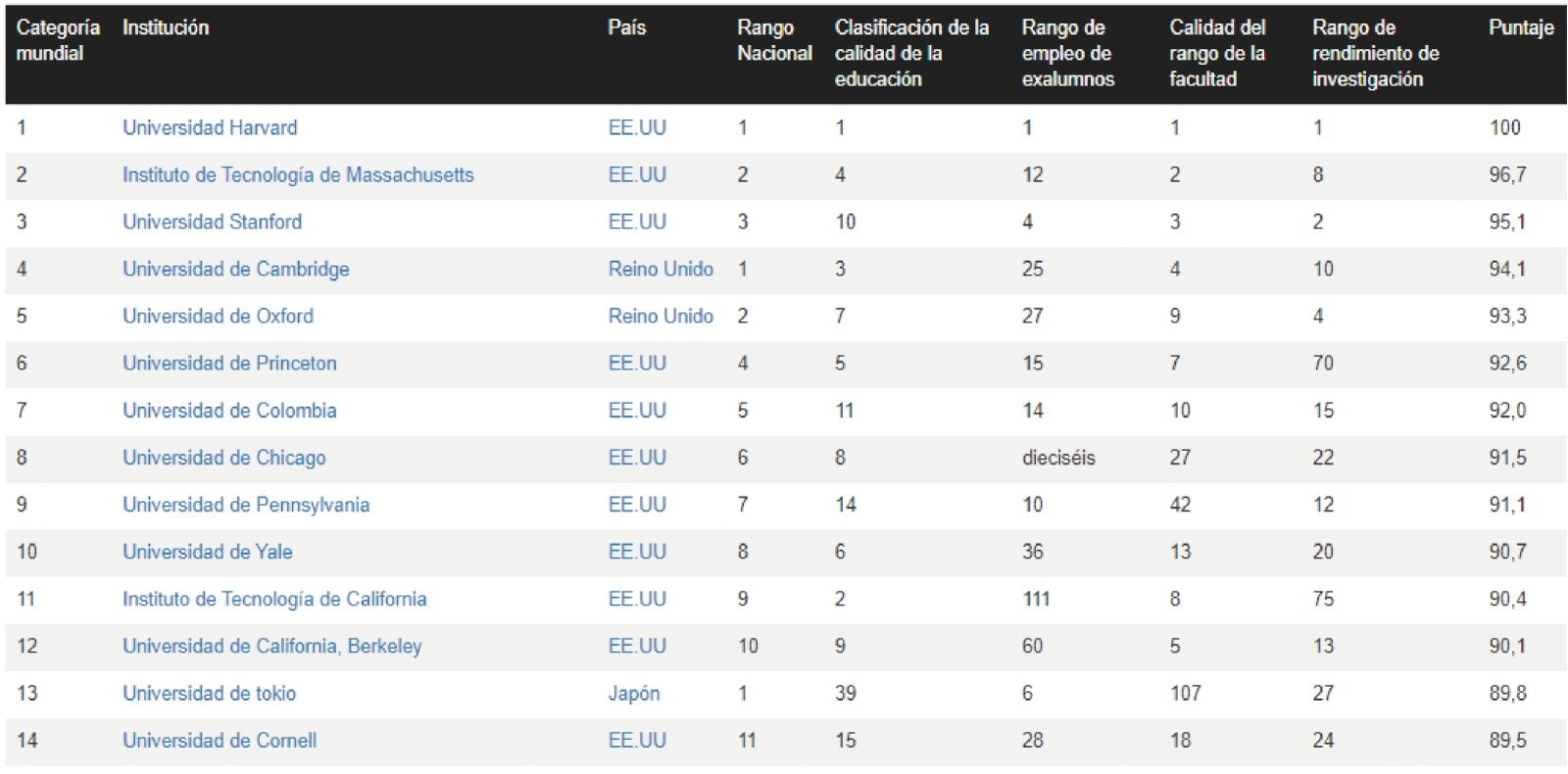 A nivel mundial, las instituciones más prestigiosas fueron las de Estados Unidos, donde el ranking fue ocupado por: Universidad de Harvard, el Instituto de Tecnología de Massachusetts y la Universidad de Stanford.