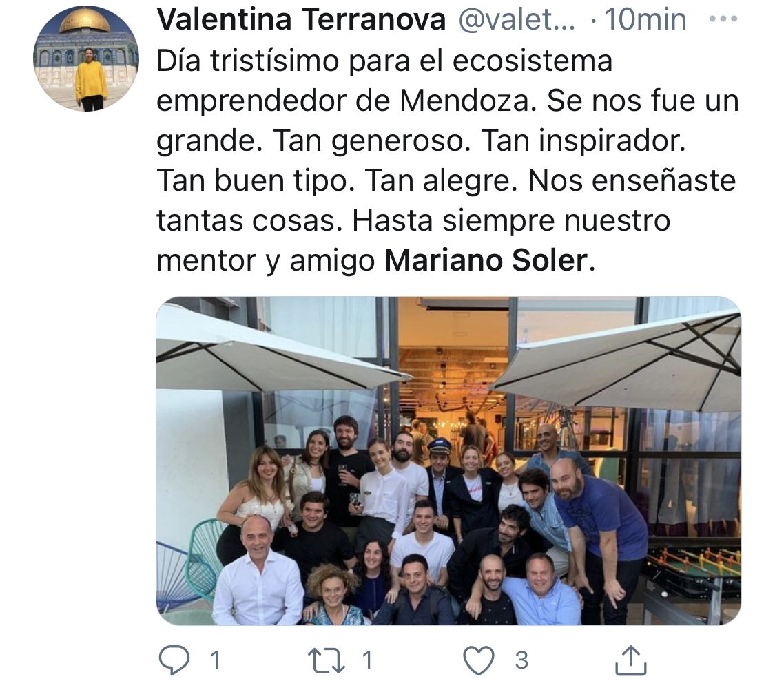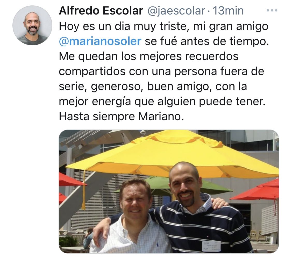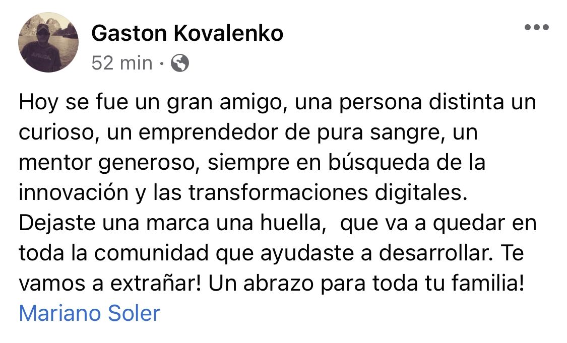 La noticia se conoció a través de las redes sociales y no tardaron en llegar los lamentos y condolencias de empresarios, periodistas, políticos, y reconocidos miembros de la sociedad mendocina: A los 53 años, y debido a complicaciones por un cuadro de covid-19, dejó de existir Mariano Soler, un entusiasta emprendedor mendocino, pionero en lo referente a los negocios digitales.