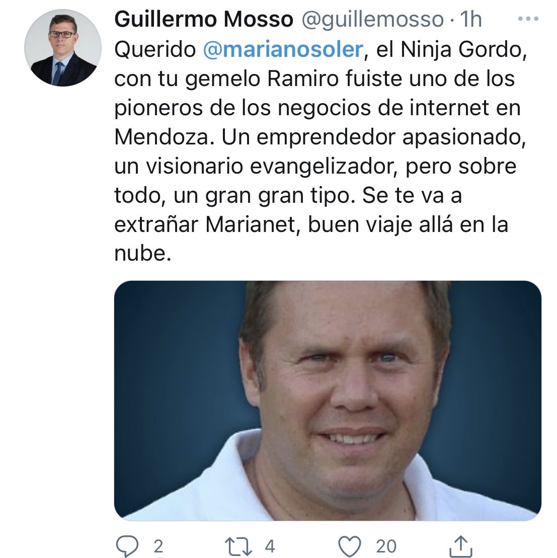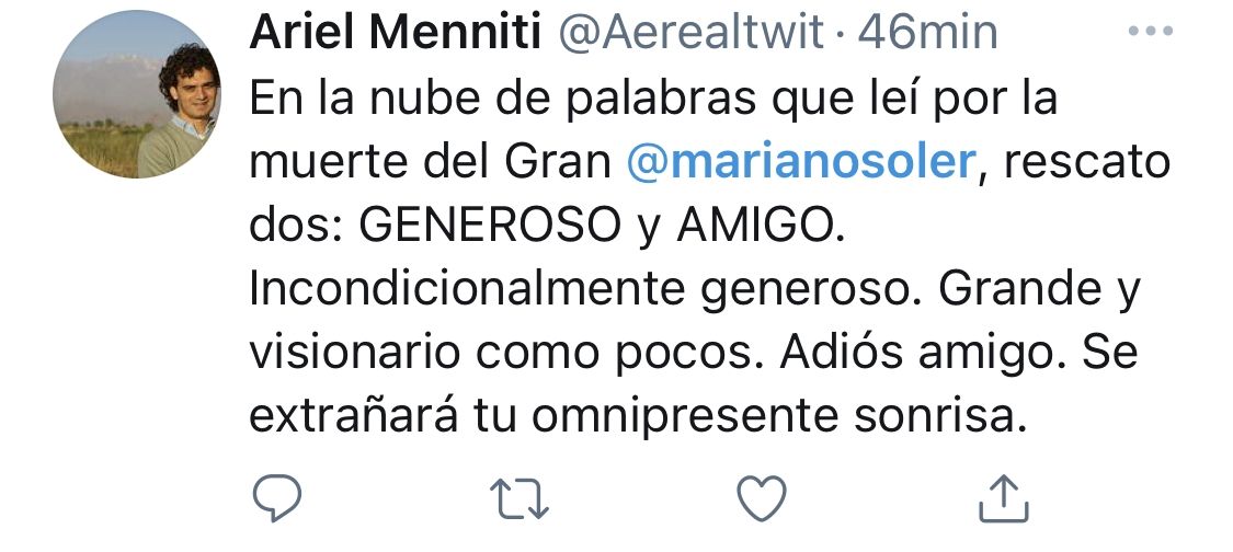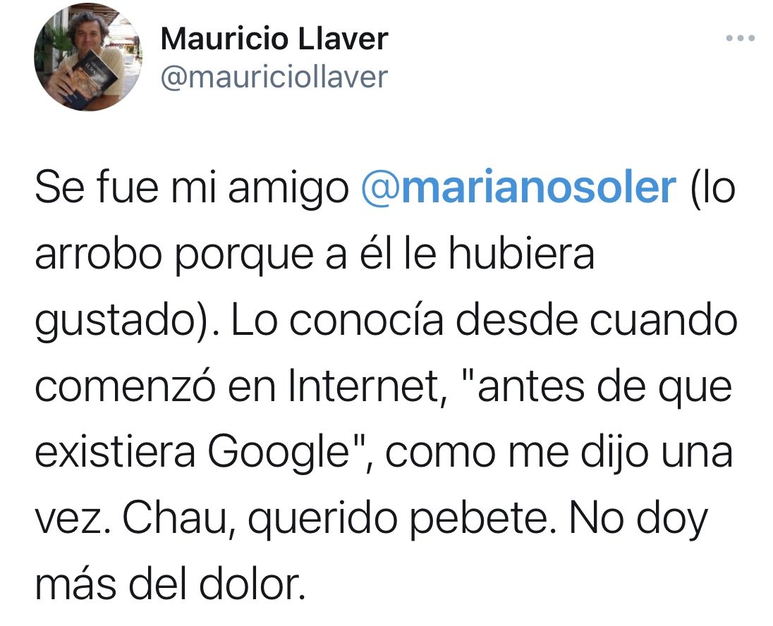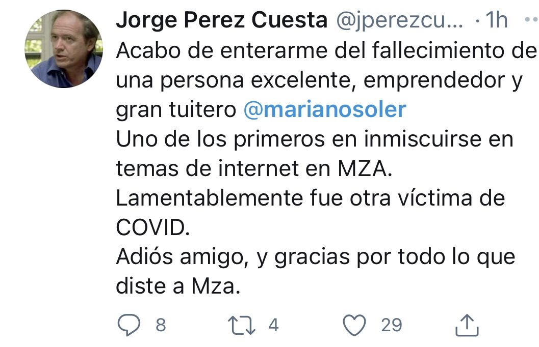 La noticia se conoció a través de las redes sociales y no tardaron en llegar los lamentos y condolencias de empresarios, periodistas, políticos, y reconocidos miembros de la sociedad mendocina: A los 53 años, y debido a complicaciones por un cuadro de covid-19, dejó de existir Mariano Soler, un entusiasta emprendedor mendocino, pionero en lo referente a los negocios digitales.