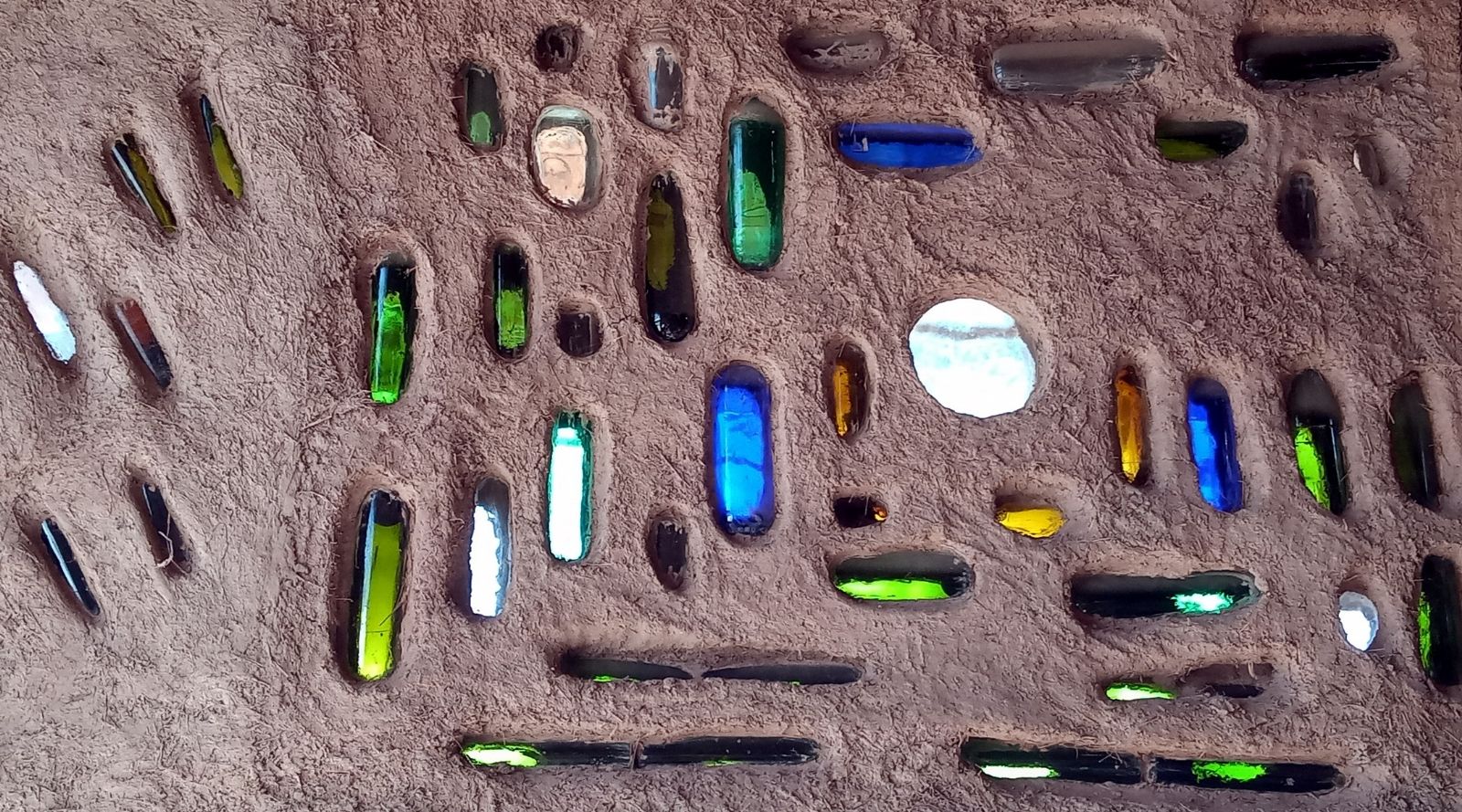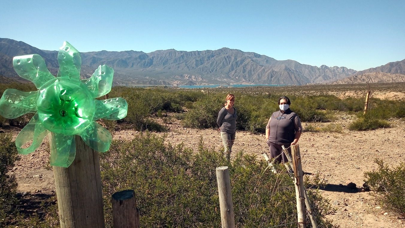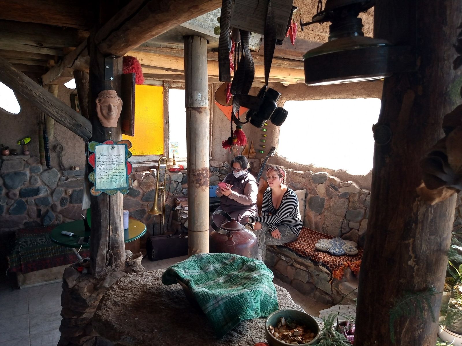 Miren: la casa es pequeña, pero hermosa: de tierra y piedra y palos y vidrios de botellas que juntaron por ahí. El baño es un baño seco: no utiliza agua y tiene una cámara bajo la casa en la que circula el aire y seca los desechos y los transforma en un compost, cuyo proceso biológico lo vuelve alimento para sembrados. Sí, por ahí, entre jarillas, crecen algunos zapallos, a pesar de todo.
