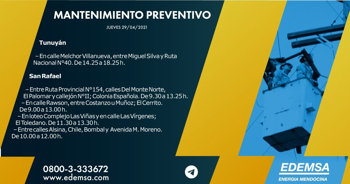 La institución avisó que, por razones de mantenimiento preventivo, este jueves 29 de abril habrá cortes del servicio en varias zonas de Mendoza, siendo los mismos en distintos horarios del territorio provincial. Garantizaron además que todas las labores a llevar adelante por los operarios cumplirán las recomendaciones de salubridad y los protocolos que se han establecido debido a la pandemia.