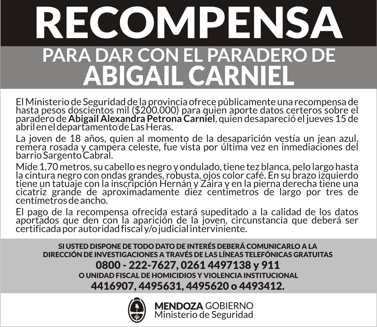 El Ministerio de Seguridad de Mendoza ofrece una recompensa de $200.000 para quien pueda aportar información certera sobre el paradero de Abigail Carniel, la joven de 18 años que lleva dos semanas desaparecida.