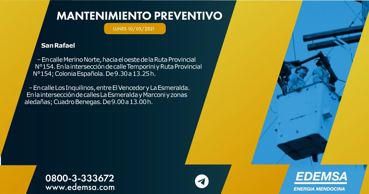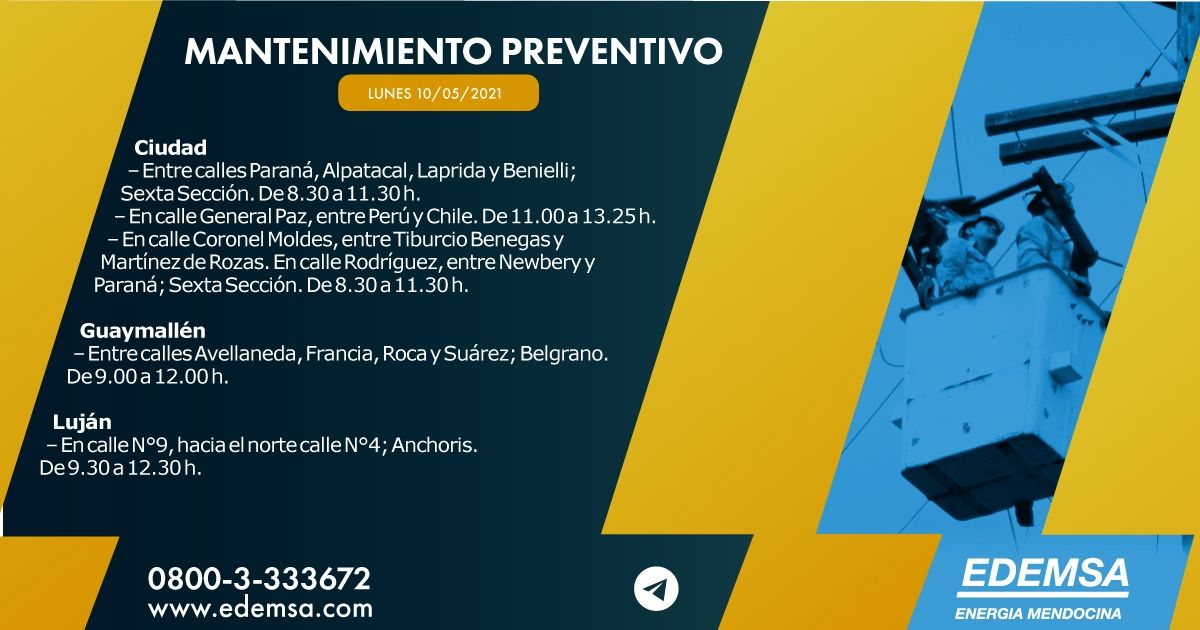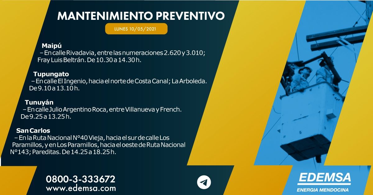Edemsa avisó que, por razones de mantenimiento preventivo, este lunes 10 de mayo habrá cortes del servicio en diferentes zonas y horarios del territorio provincial. Garantizaron además que todas las labores a llevar adelante por los operarios cumplirán las recomendaciones de salubridad y los protocolos que se han establecido debido a la pandemia.