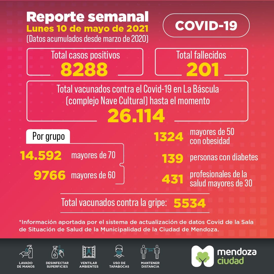 A partir de este lunes, la Ciudad de Mendoza presentará un reporte semanal con los datos epidemiológicos registrados en el municipio respecto de la pandemia de coronavirus. Además, agregarán información sobre la campaña de vacunación y la actualización de los protocolos sanitarios vigentes. Será publicado todos los lunes.