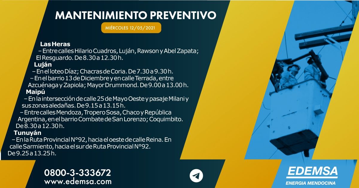 La institución explicó que este miércoles 12 de mayo habrá cortes de luz en diferentes zonas de Mendoza: concretamente serán cinco los departamentos que sufrirán estas privaciones de energía.