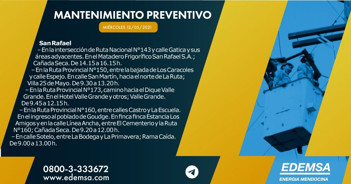 Desde Edemsa detallaron las diferentes acciones de mantenimiento preventivo que realizarán, y por las cuales cortarán el servicio en diferentes horarios y en varias zonas de la provincia. A continuación, las diferentes interrupciones y por cuánto tiempo se harán.