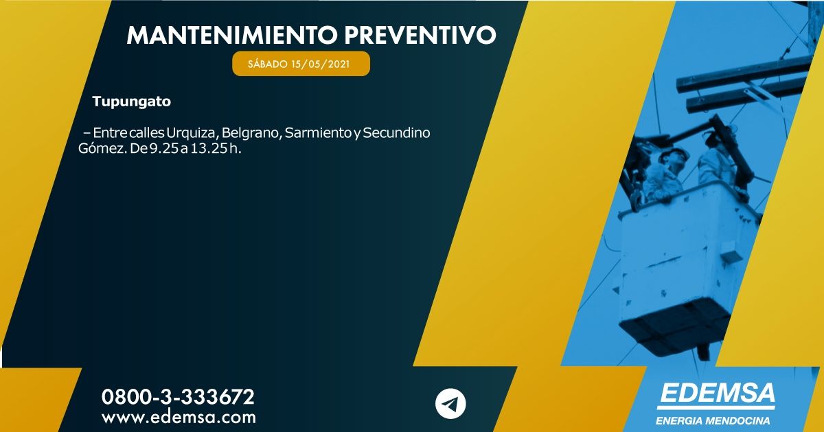 El único lugar en donde Edemsa tiene previsto realizar trabajos que impliquen una suspensión del servicio es en Tupungato, más precisamente entre calles Urquiza, Belgrano, Sarmiento y Secundino Gómez. La interrupción del abastecimiento de energía será entre las 9.25 y las 13.25 horas.