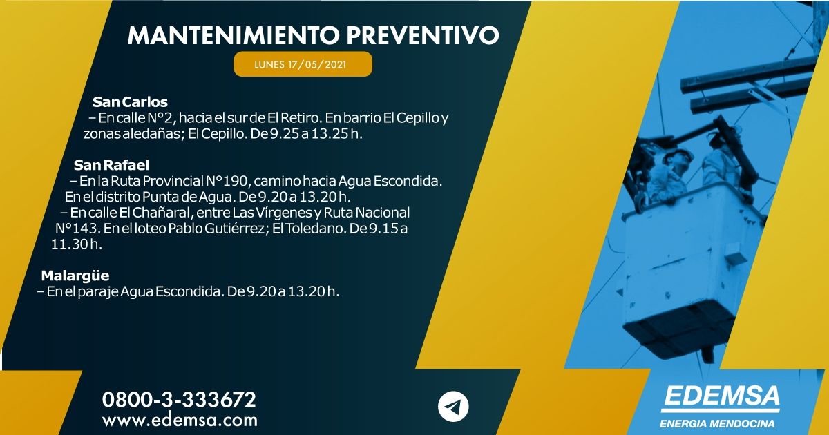 La institución ha comunicado, como todos los días lo hace a través de Twitter, el cronograma de cortes de energía. Los mismos corresponden al día lunes 17 de mayo del corriente. Las interrupciones se producirán, en este caso, en Las Heras, Luján de Cuyo, Maipú, Tupungato, San Carlos, San rafael y Malargüe.