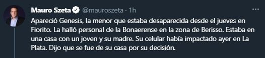 Génesis Altamirano, la adolescente de 15 años que era intensamente buscada desde el jueves pasado cuando salió de su casa en la localidad bonaerense de Villa Fiorito, apareció sana y salva este martes.