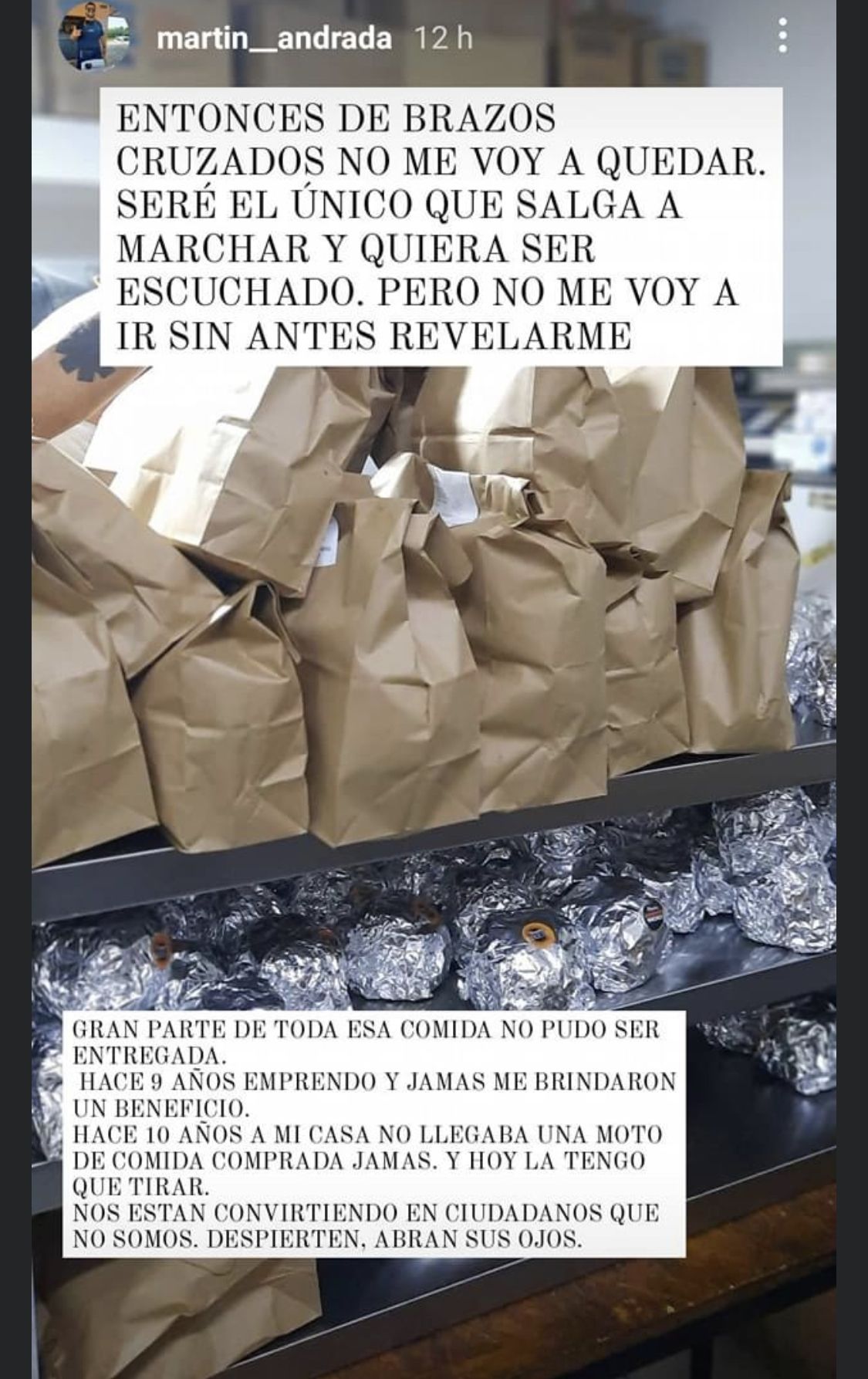 ¿A quién, acaso, no le enseñaron de pequeño que tirar la comida era un pecado? Pues esta es la encrucijada que se le presentó a Martín. "Gran parte de toda esta comida no pudo ser entregada. Hace 9 años que emprendo y jamás me brindaron un beneficio. Hace 10 años a mi casa no llegaba una moto de comida comprada jamás. Y hoy la tengo que tirar. Nos están convirtiendo en ciudadanos que no somos", expresó con angustia.