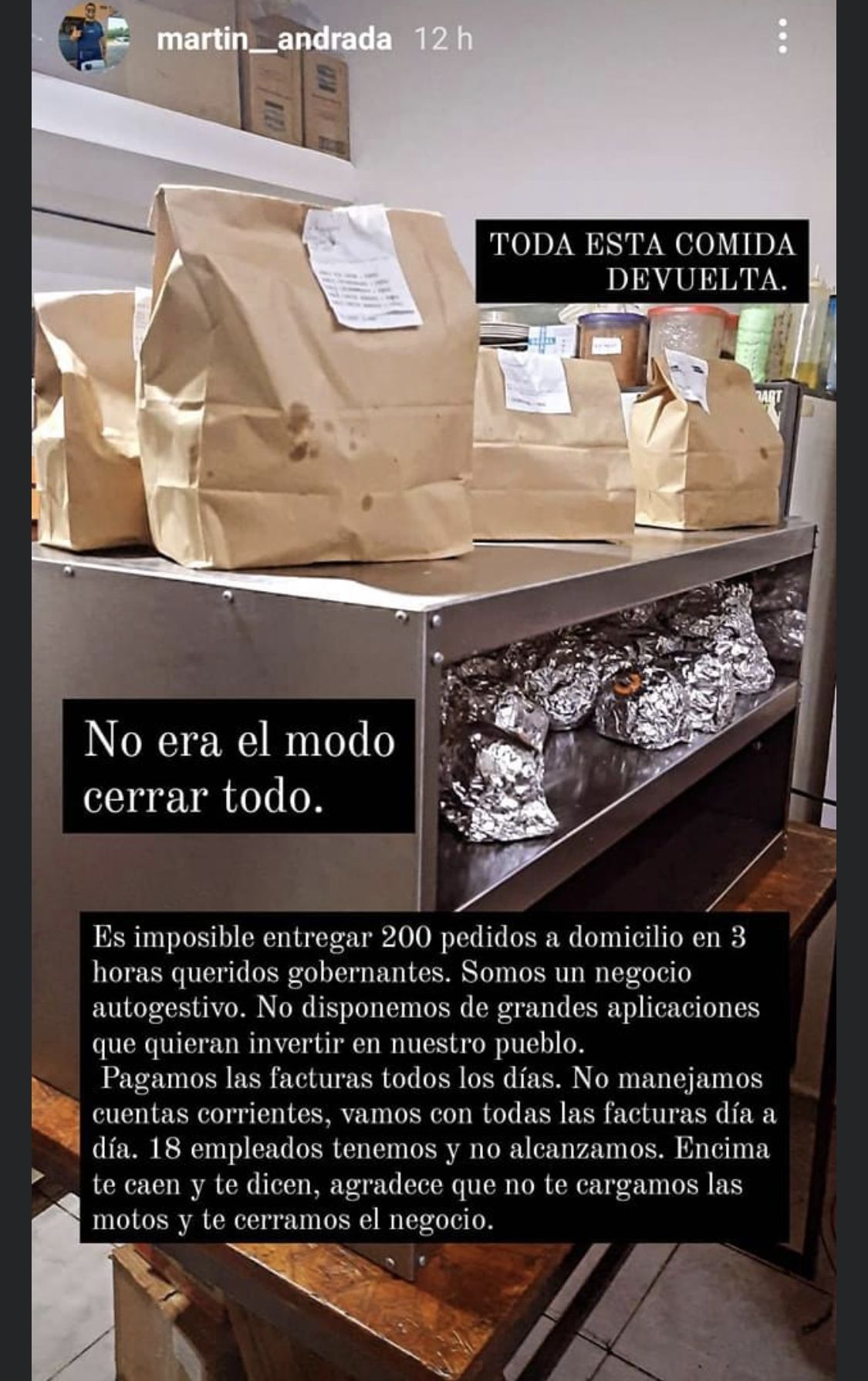 La amargura de Martín tuvo que ver con la imposibilidad de entregar los pedidos que sus clientes le hacían en tan poco tiempo. "Es imposible entregar 200 pedidos a domicilio en tres horas, queridos gobernantes. Somos un negocio autogestivo. No disponemos de grande aplicaciones que quieran invertir en nuestro pueblo", escribió el hombre.