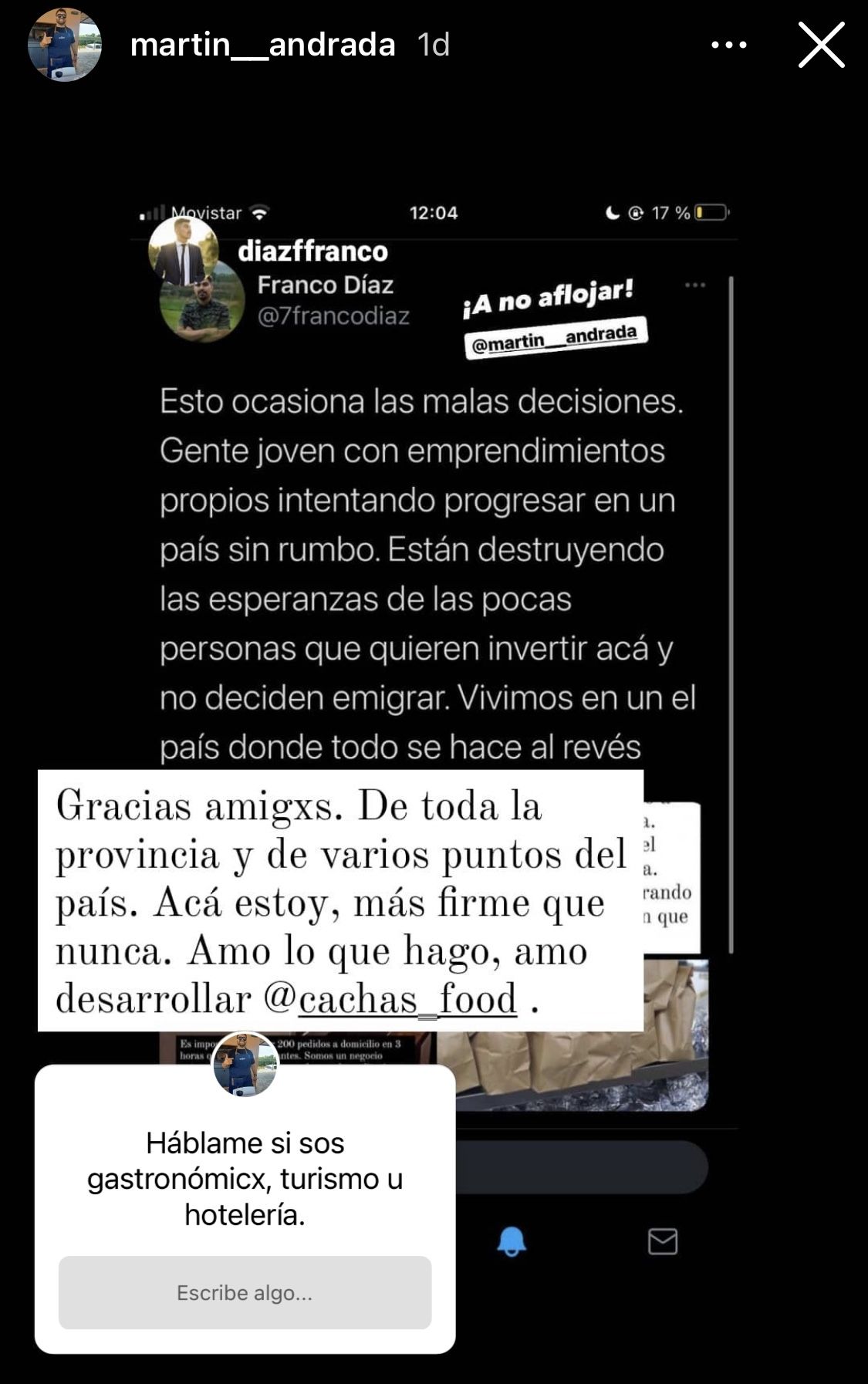 Martín es uno más de los miles de emprendedores mendocinos que, desde que comenzó la pandemia, se han visto particularmente perjudicados. Es gastronómico, y tiene una hamburguesería -Cacha´s- en Junín. Con tristeza e impotencia, hace unos días realizó un posteo en sus historias de Instagram que, sin querer, se volvió viral y fueron muchos los que se hicieron eco de sus palabras.