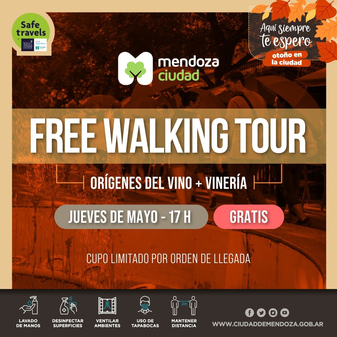 La Municipalidad de Mendoza invita en el mes de mayo a disfrutar de los Free Walking Tours de la Ciudad. La propuesta ofrece recorridos a pie por las calles capitalinas con temáticas variadas los días jueves, viernes y sábados del mes, donde se descubrirán distintos rincones del departamento.