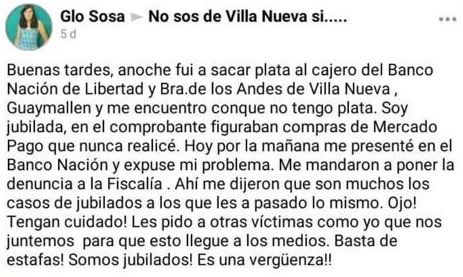 "Anoche fui a sacar plata al cajero del Banco Nación de Villa Nueva y me encuentro con que no tengo plata. Soy jubilada y en el comprobante figuraban compras de Mercado Pago que nunca realicé. En el Banco Nación me mandaron a poner la denuncia a la Fiscalía. Ahí me dijeron que son muchos los casos de jubilados a los que les ha pasado lo mismo", sumó su testimonio Gloria.