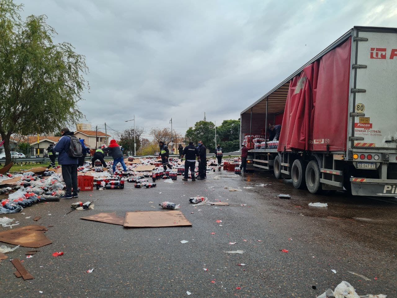 Se comió la curva: camión volcó miles de botellas de gaseosa en plena calle