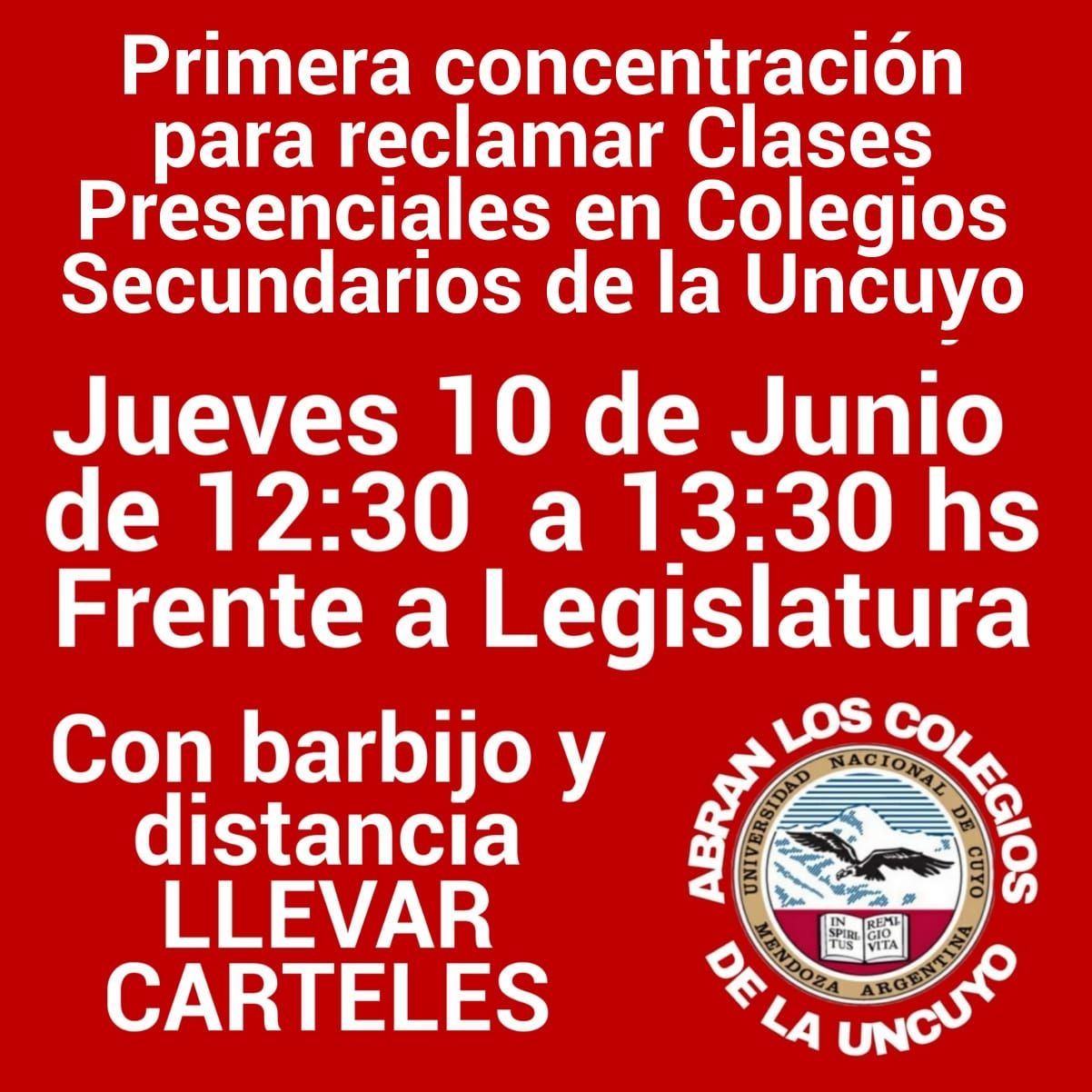 El comunicado emitido por la Universidad Nacional de Cuyo donde anuncian el regreso escalonado a la presencialidad en los colegios secundarios no convence a padres y estudiantes que asisten a dichas instituciones. La propuesta contempla un cursado mínimo hasta el inicio del receso invernal y no aporta una real solución al reclamo de fondo. Hoy a las 12:30 hs se concentrarán en la Legislatura para reclamar por una presencialidad sostenida.