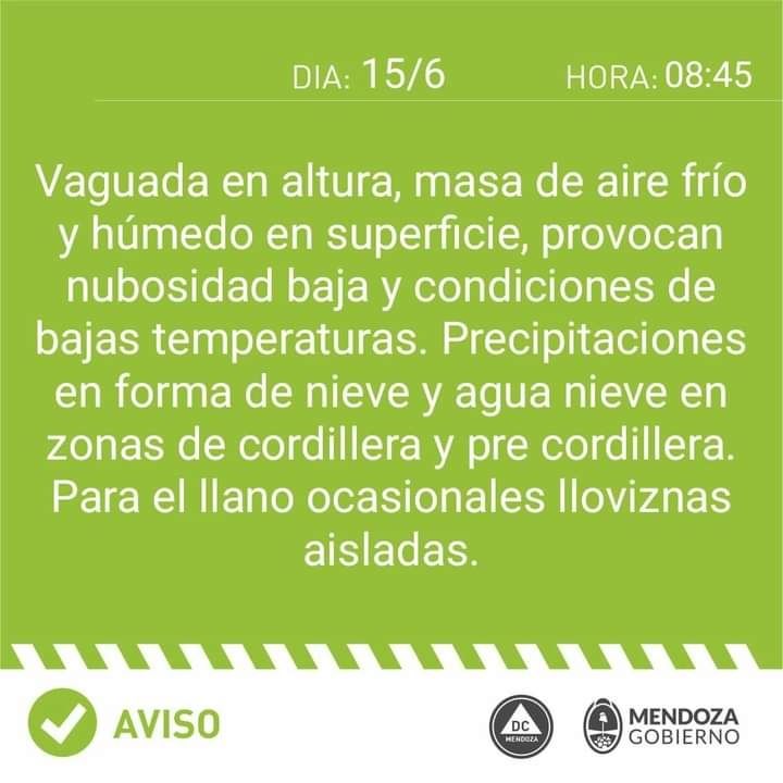 "Vaguada en altura, masa de aire frío y húmedo en superficie provocan nubosidad baja y condiciones de baja temperatura. Precipitaciones en forma de nieve y aguanieve en zonas de cordillera y precordillera. Para el llano, ocasionales lloviznas aisladas", expresa el comunicado de Defensa Civil.