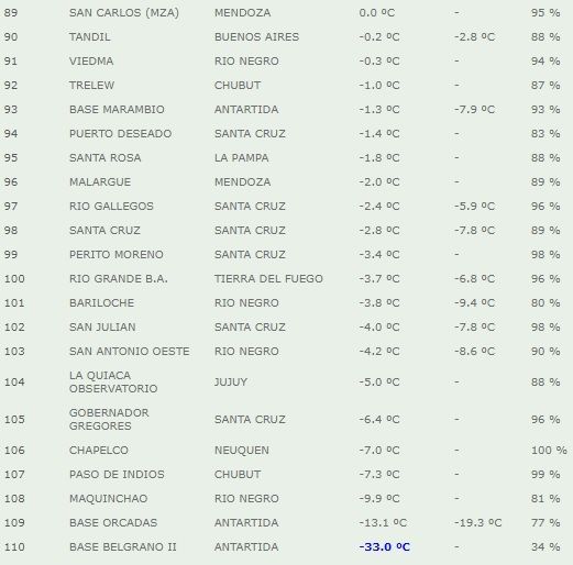El Servicio Meteorológico Nacional indica que tanto en el norte como el en sur hay zonas heladas. Maquinchao, en Río Negro, es el lugar más frío en la Argentina continental, con -9,9º. Más al sur, Base Orcadas y Base Belgrano II, en Antártida, tienen -13.1º y -33º respectivamente.