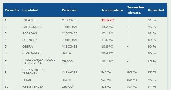 Las temperaturas de todos los observatorios del SMN quedan registradas en un ranking que muestra desde la más caliente hasta la más fría. La más cálida en este momento es Iguazú, con 13.6º.
