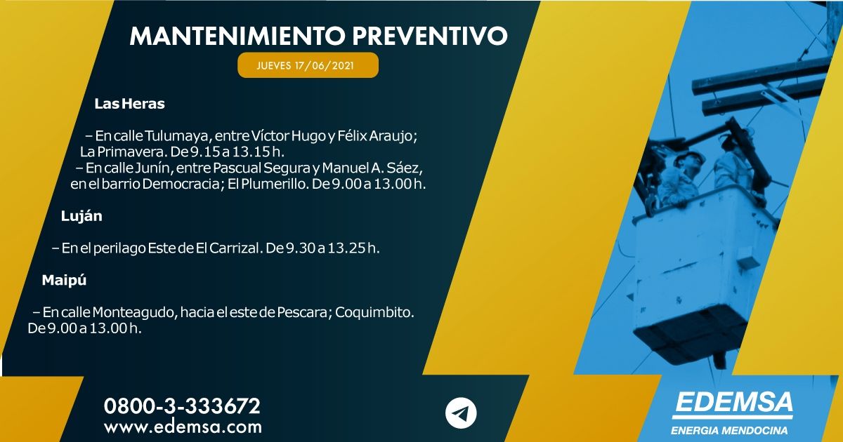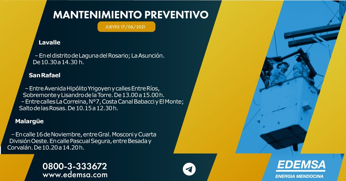 La Institución ha informado el cronograma de cortes de energía que pondrá en acción hoy, jueves 17 de junio, en su cuenta oficial de Twitter. Las interrupciones se producirán, en este caso, en cinco departamentos mendocinos: Las Heras, Luján de Cuyo, Maipú, Lavalle, San Rafael y Malargüe; y serán para realizar mantenimiento preventivo.