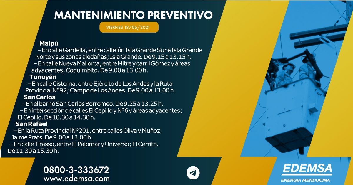 Edemsa ha informado el cronograma de cortes de energía que pondrá en acción hoy, viernes 18 de junio, en su cuenta oficial de Twitter. Las interrupciones se producirán, en este caso, en cuatro departamentos mendocinos: Maipú, Tunuyán, San Carlos y San Rafael.