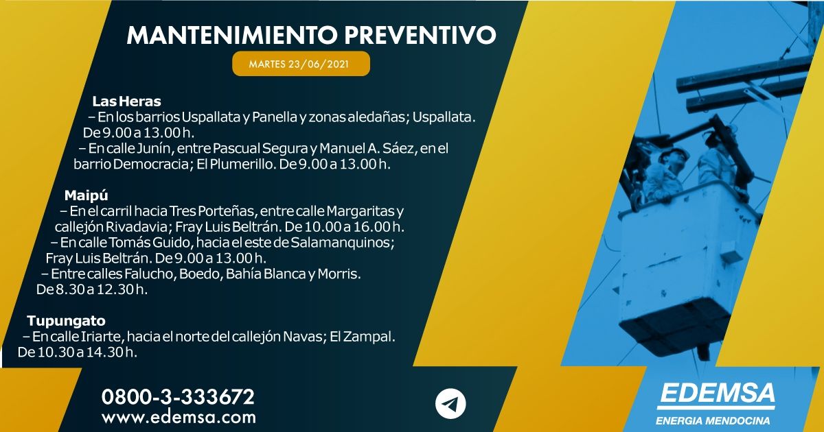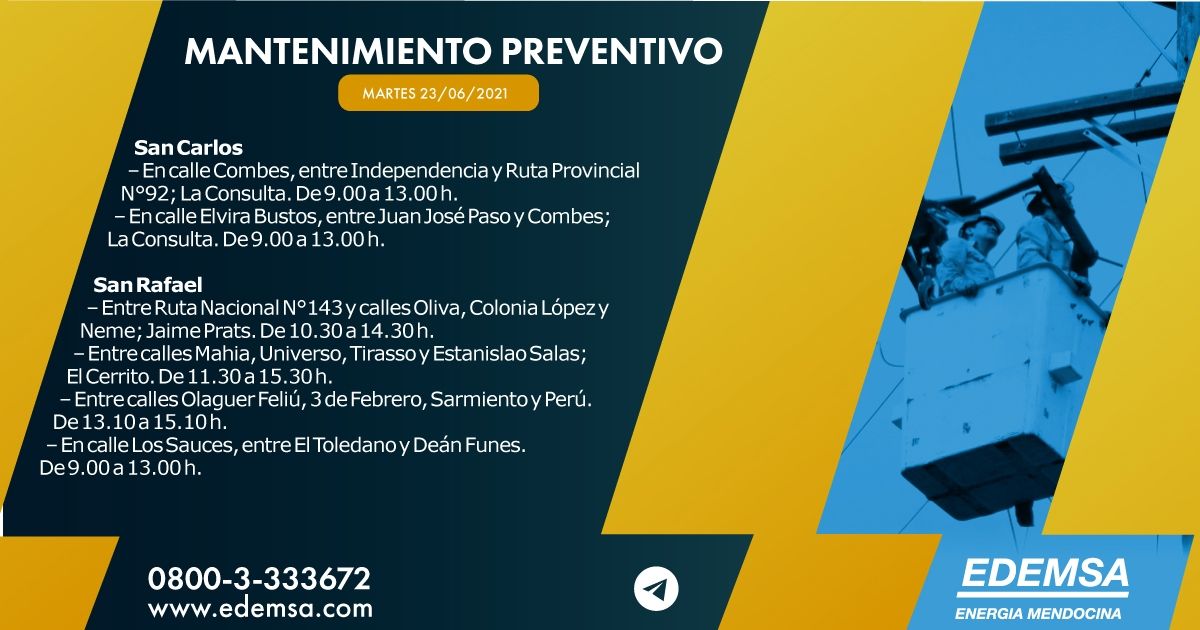 La Institución ha informado el cronograma de cortes de energía que pondrá en acción hoy, jueves 17 de junio, en su cuenta oficial de Twitter. Las interrupciones se producirán, en este caso, en cinco departamentos mendocinos: Las Heras, Maipú, Tupungato, San Carlos y San Rafael; y serán para realizar mantenimiento preventivo.