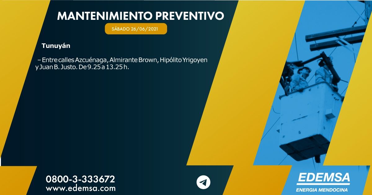 Edemsa ha informado el cronograma de cortes de energía que pondrá en acción hoy, sábado 26 de junio, en su cuenta oficial de Twitter. Las interrupciones se producirán, en este caso, solo en un departamento de Mendoza: Tunuyán.