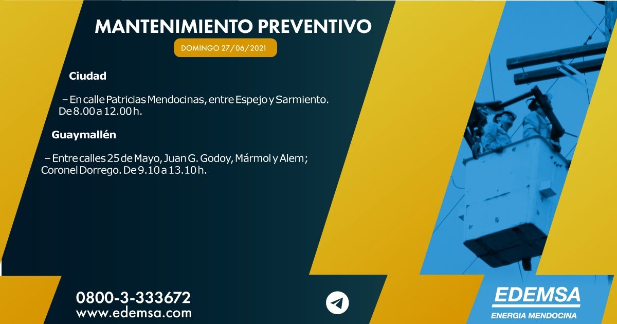 La Institución ha informado el cronograma de cortes de energía que pondrá en acción hoy, domingo 27 de junio, en su cuenta oficial de Twitter. Las interrupciones se producirán, en este caso, en cinco departamentos mendocinos: Ciudad y Guaymallén; y serán para realizar mantenimiento preventivo.