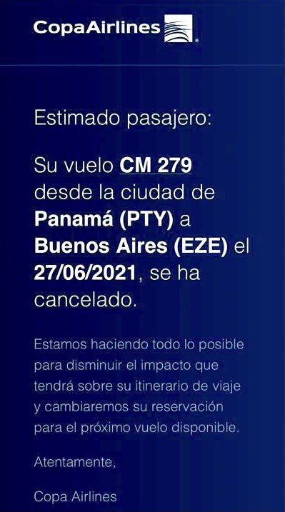 Al mismo tiempo, otros usuarios compartieron el comunicado de la empresa panameña, confirmando, justamente, la cancelación de dicho vuelo. "Estimado pasajero: Su vuelo CM 279 desde la ciudad de Panamá (PTY) a Buenos Aires (EZE) el 27/06/2021, se ha cancelado. Estamos haciendo lo posible para disminuir el impacto que tendrá su itinerario de viaje y cambiaremos su reservación para el próximo vuelo disponible", dice el mensaje.