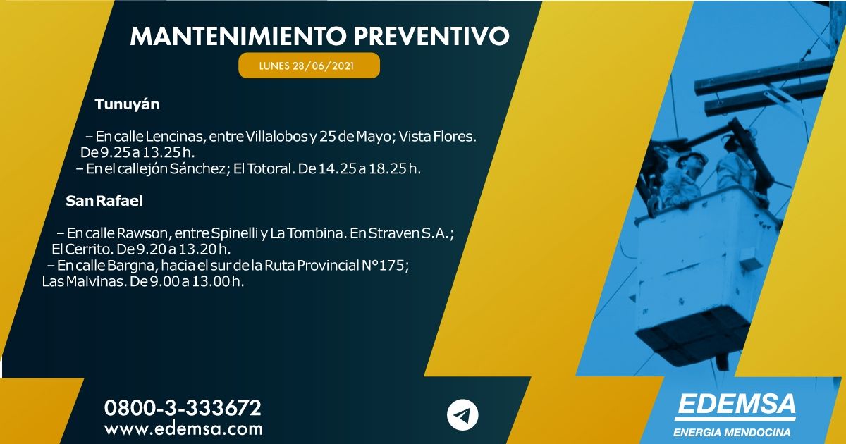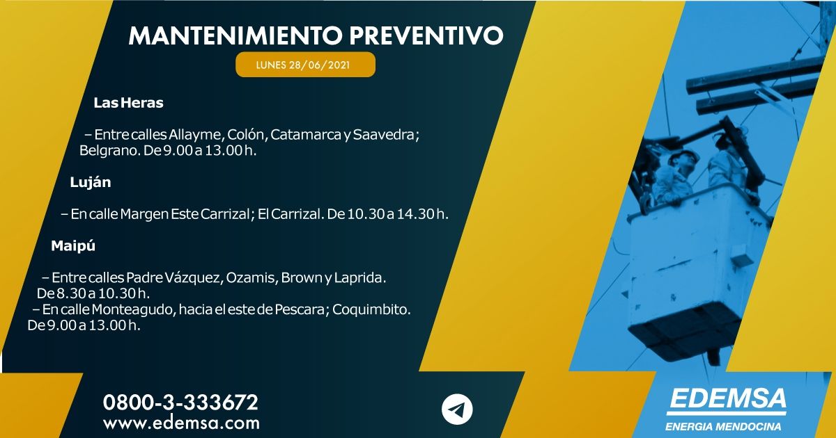 La Institución ha informado el cronograma de cortes de energía que pondrá en acción hoy, lunes 28 de junio, en su cuenta oficial de Twitter. Las interrupciones se producirán, en este caso, en cinco departamentos mendocinos Las Heras, Luján de Cuyo, Maipú, Tunuyán y San Rafael; y serán para realizar mantenimiento preventivo.