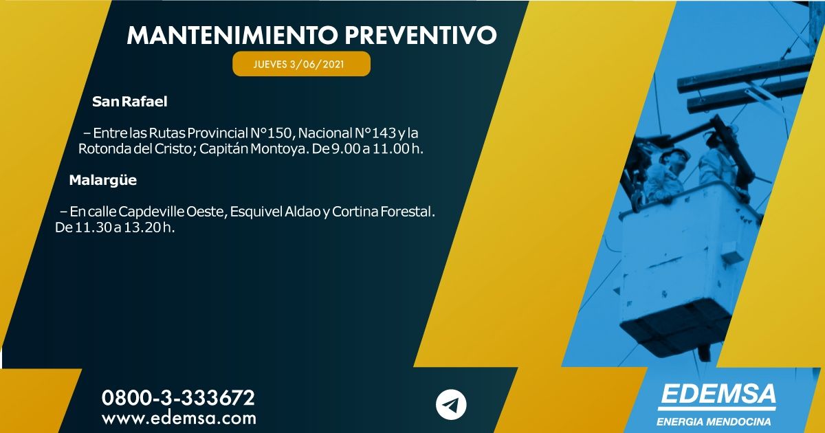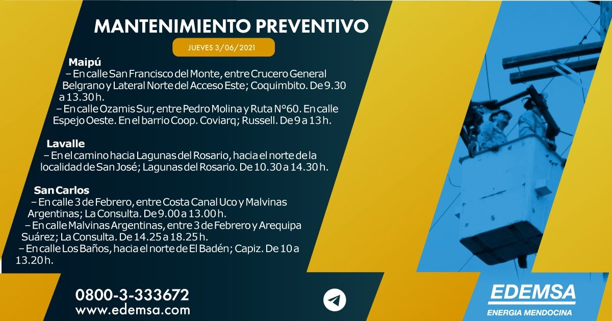 Edemsa ha informado el cronograma de cortes de energía que pondrá en acción hoy, jueves 3 de junio, en su cuenta oficial de Twitter. Las interrupciones se producirán, en este caso, en cuatro departamentos mendocinos: Maipú, Lavalle, San Carlos, San Rafael y Malargüe.