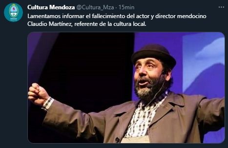 El Ministerio de Cultura y Turismo de Mendoza confirmó la triste noticia a través de su cuenta de Twitter. "Lamentamos informar el fallecimiento del actor y director mendocino Claudio Martínez, referente de la cultura local", escribieron desde la cuenta oficial del Ministerio.
