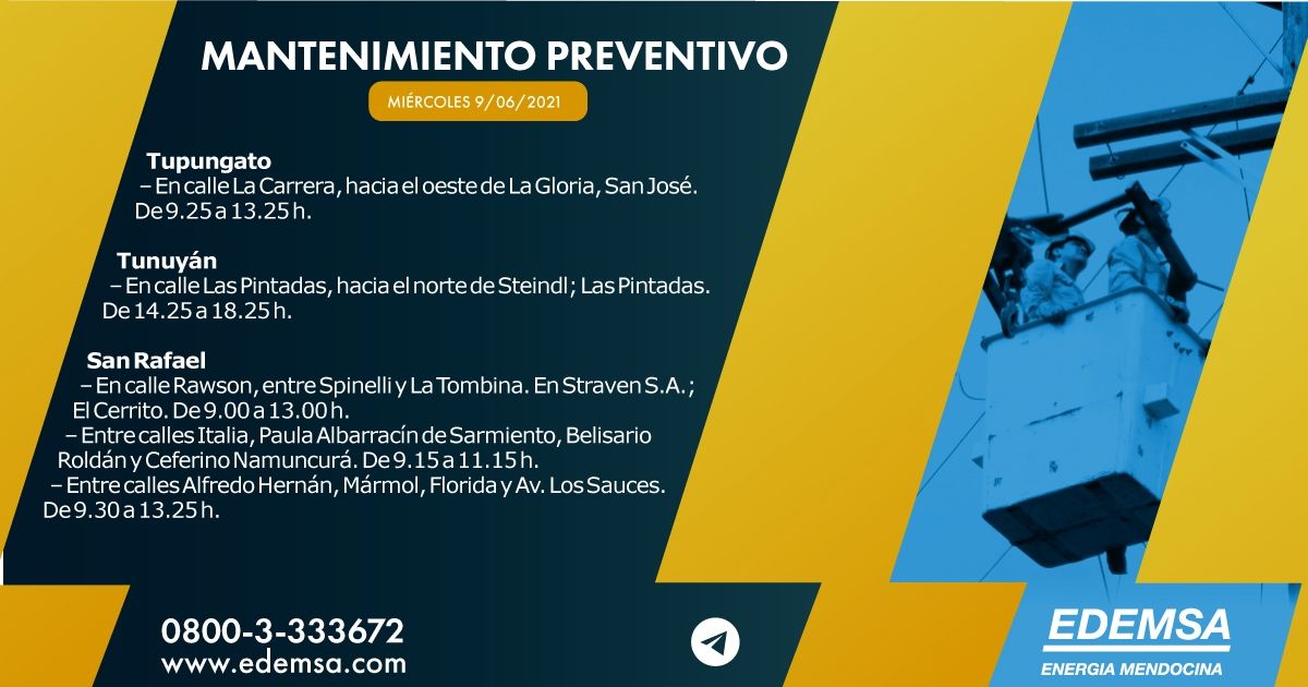 La Institución ha informado el cronograma de cortes de energía que pondrá en acción hoy, miércoles 9 de junio, en su cuenta oficial de Twitter. Las interrupciones se producirán, en este caso, en cinco departamentos mendocinos: Guaymallén, Maipú, Tupungato, Tunuyán y San Rafael; y serán para realizar mantenimiento preventivo.