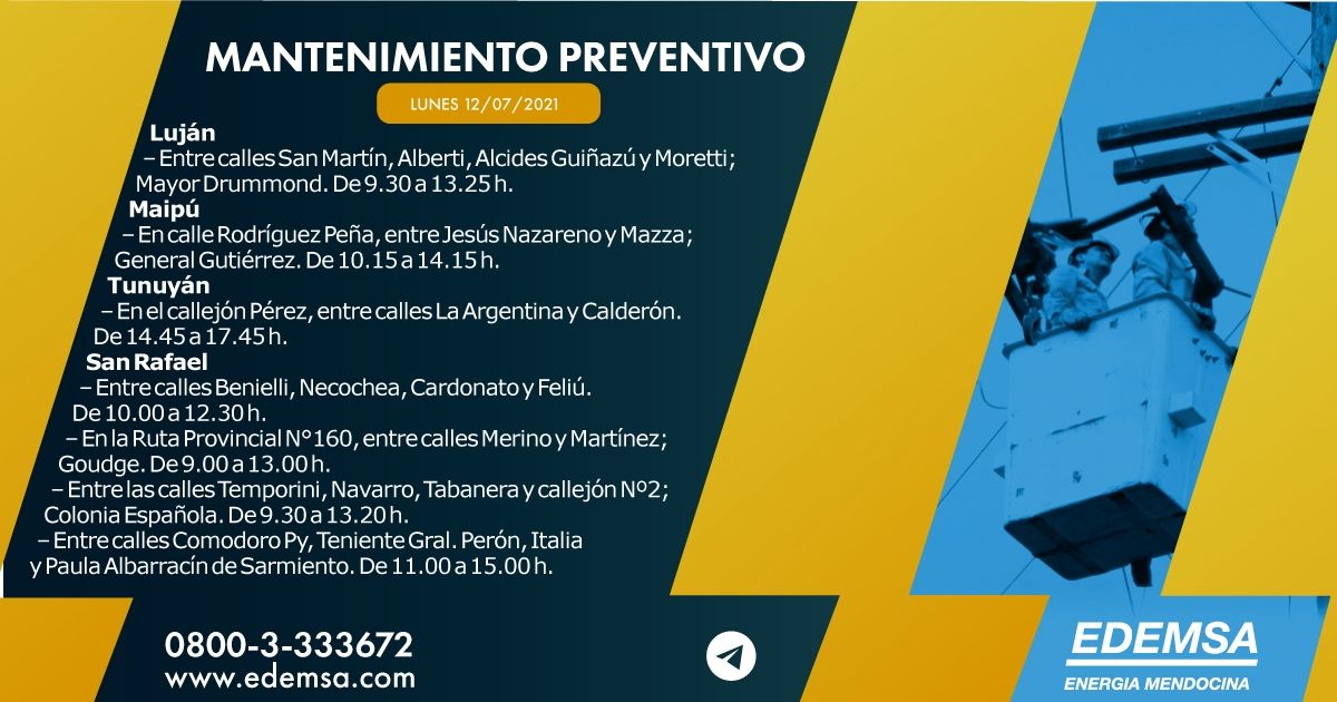 La Institución ha informado el cronograma de cortes de energía que pondrá en acción hoy, lunes 12 de julio, en su cuenta oficial de Twitter. Las interrupciones se producirán, en este caso, en cuatro departamentos mendocinos: Luján de Cuyo, Maipú, Tunuyán y San Rafael; y serán para realizar mantenimiento preventivo.