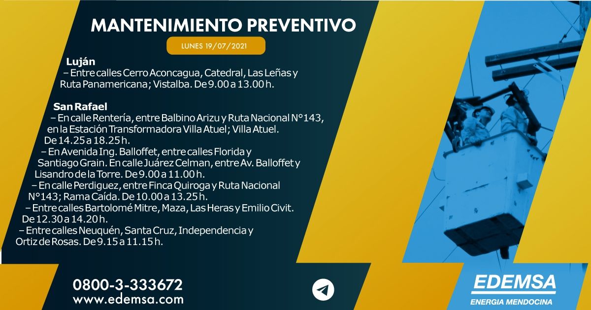 La Institución ha informado el cronograma de cortes de energía que pondrá en acción hoy, lunes 19 de julio, en su cuenta oficial de Twitter. Las interrupciones se producirán, en este caso, en dos departamentos mendocinos: Luján de Cuyo y San Rafael; y serán para realizar mantenimiento preventivo.