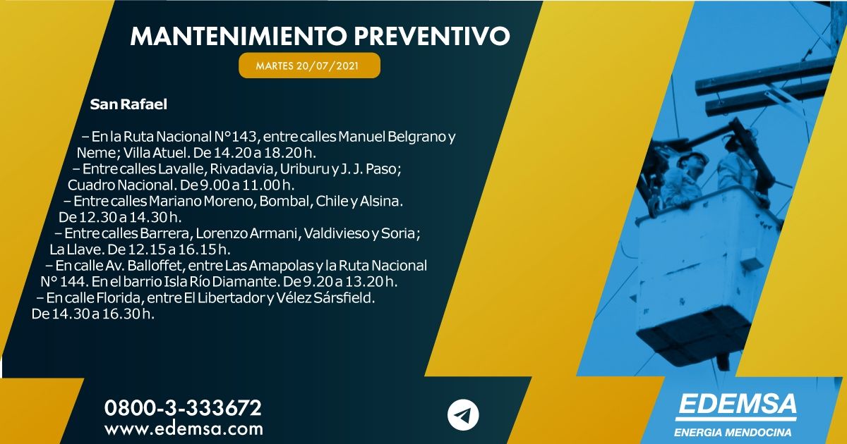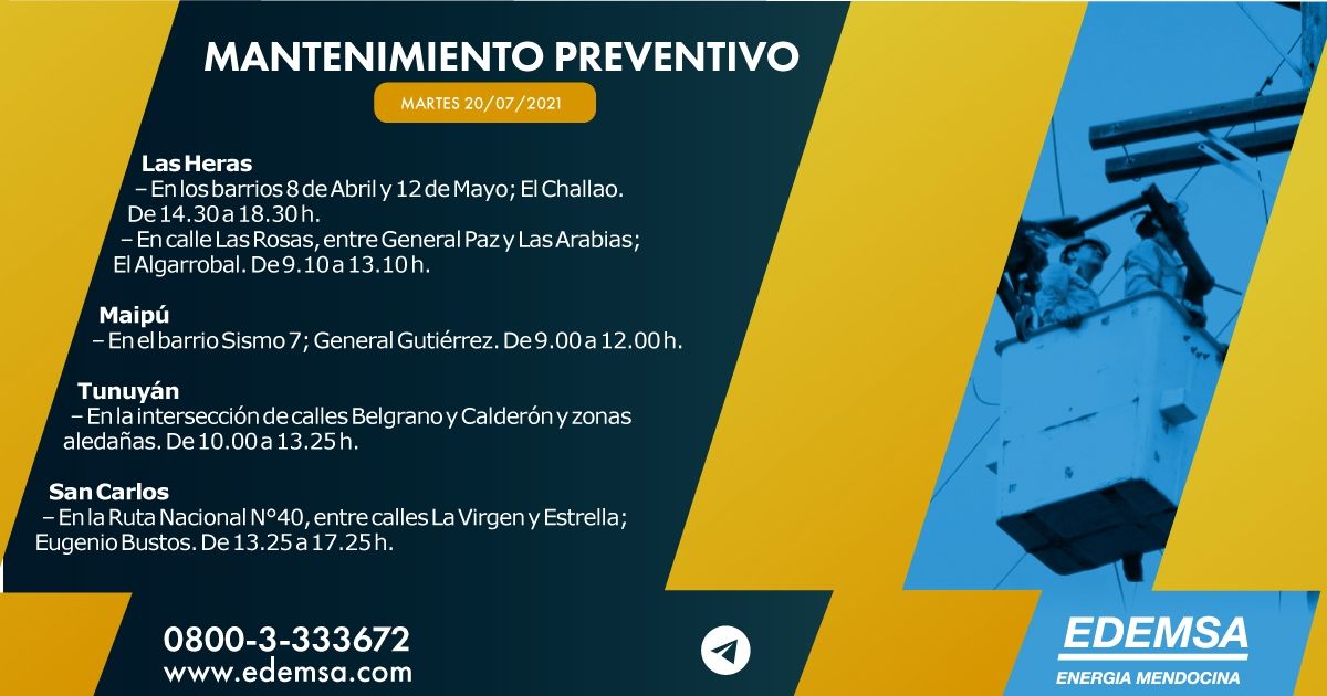 La Institución ha informado el cronograma de cortes de energía que pondrá en acción hoy, martes 20 de julio, en su cuenta oficial de Twitter. Las interrupciones se producirán, en este caso, en cinco departamentos mendocinos: Las Heras, Maipú, Tunuyán, San cCarlos y San Rafael; y serán para realizar mantenimiento preventivo.