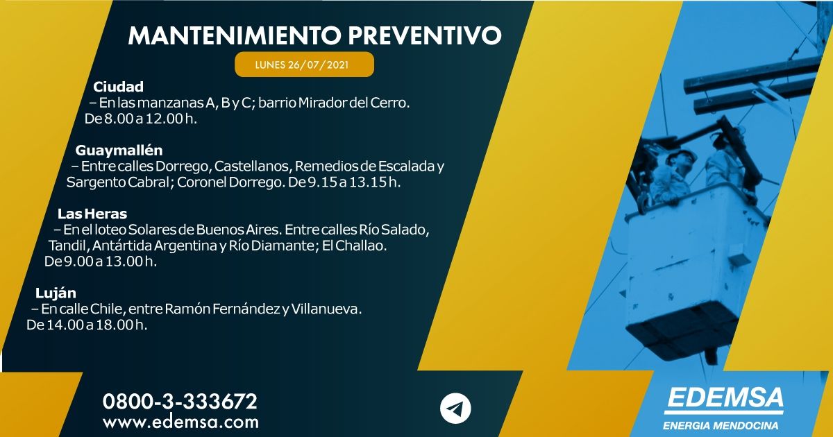 La Institución ha informado el cronograma de cortes de energía que pondrá en acción hoy, lunes 26 de julio, en su cuenta oficial de Twitter. Las interrupciones se producirán, en este caso, en seis departamentos mendocinos: Ciudad, Guaymallén, Las Heras, Luján de Cuyo, San Carlos y San Rafael; y serán para realizar mantenimiento preventivo.