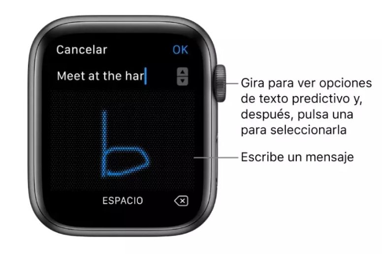 - Escribir: el Apple Watch tiene como opción escribir, pero se tiene que hacer letra por letra y no es lo más rápido.