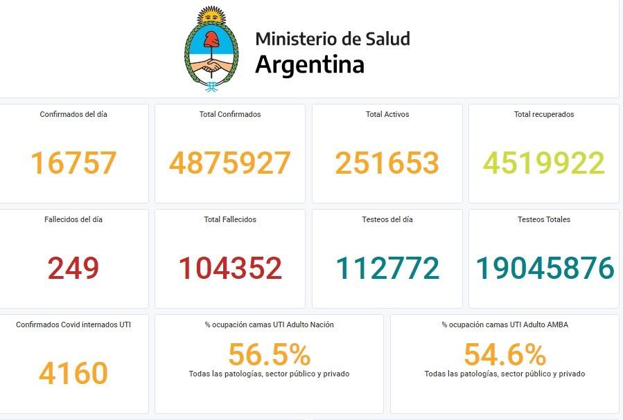La cartera sanitaria indicó que son 4.160 los internados en unidades de terapia intensiva (UTI), con un porcentaje de ocupación de camas de adultos de 56.5% en el país y del 54.6% en la Área Metropolitana Buenos Aires (AMBA).