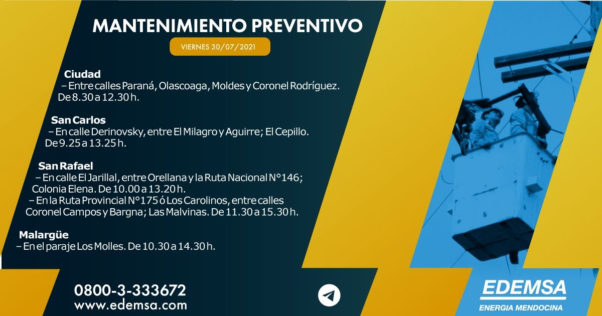 La Institución ha informado el cronograma de cortes de energía que pondrá en acción hoy, viernes 30 de julio, en su cuenta oficial de Twitter. Las interrupciones se producirán, en este caso, en cuatro departamentos mendocinos: Ciudad, San Carlos, San Rafael y Malargüe; y serán para realizar mantenimiento preventivo.