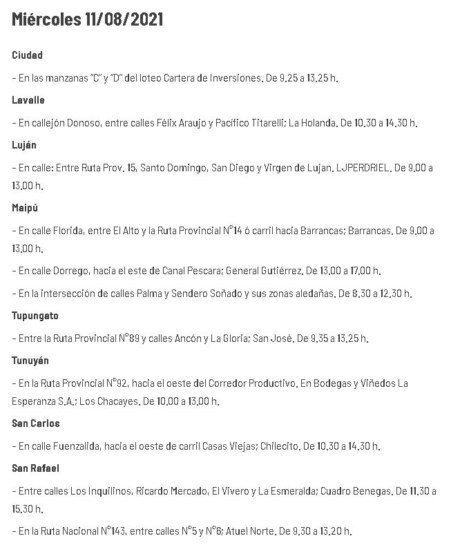 La Institución ha informado el cronograma de cortes de energía que pondrá en acción hoy, miércoles 11 de agosto, en su cuenta oficial de Twitter. Las interrupciones se producirán, en este caso, en ocho departamentos mendocinos: Ciudad, Lavalle, Luján de Cuyo, Maipú, Tupungato, Tunuyán, San Carlos y San Rafael, y serán para realizar mantenimiento preventivo.
