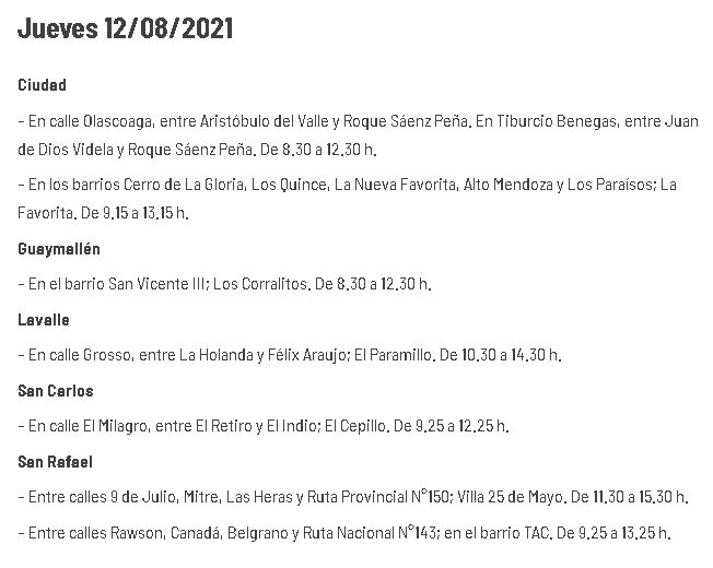 La Institución ha informado el cronograma de cortes de energía que pondrá en acción hoy, jueves 12 de agosto, en su cuenta oficial de Twitter. Las interrupciones se producirán, en este caso, en cinco departamentos mendocinos: Ciudad, Guaymallén, Lavalle, San Carlos y San Rafael, y serán para realizar mantenimiento preventivo.