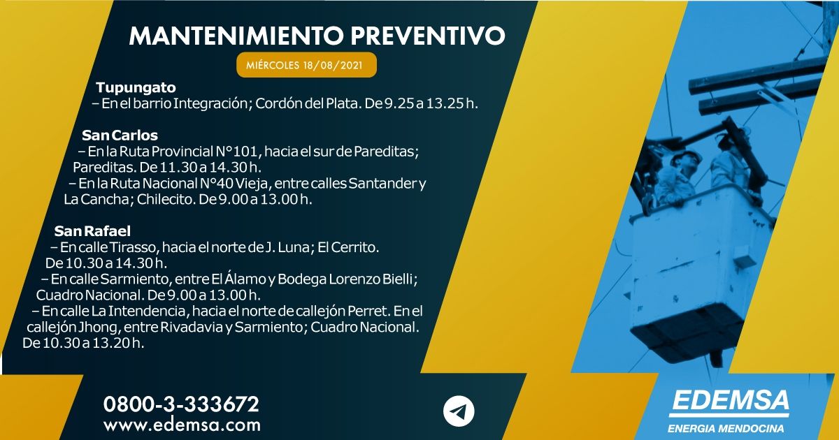 La Institución ha informado el cronograma de cortes de energía que pondrá en acción hoy, miércoles 18 de agosto, en su cuenta oficial de Twitter. Las interrupciones se producirán, en este caso, en seis departamentos mendocinos: Las Heras, Maipú, Lavalle, Tupungato, San Carlos y San Rafael, y serán para realizar mantenimiento preventivo.