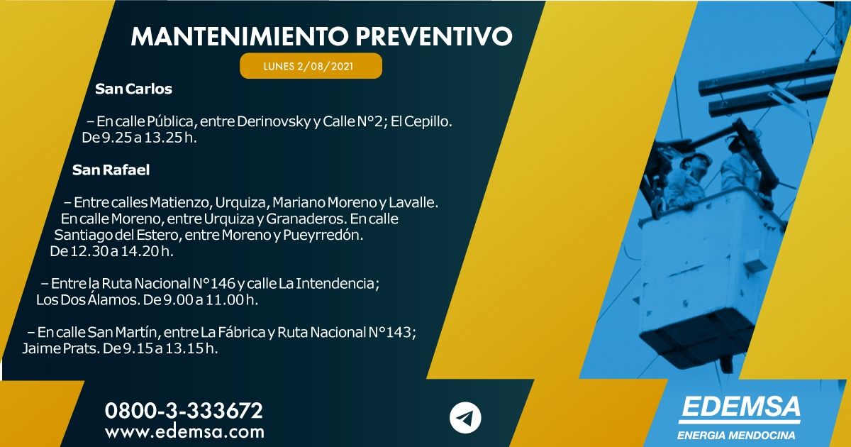 La Institución ha informado el cronograma de cortes de energía que pondrá en acción hoy, lunes 2 de agosto, en su cuenta oficial de Twitter. Las interrupciones se producirán, en este caso, en dos departamentos mendocinos: San Carlos y San Rafael; y serán para realizar mantenimiento preventivo.