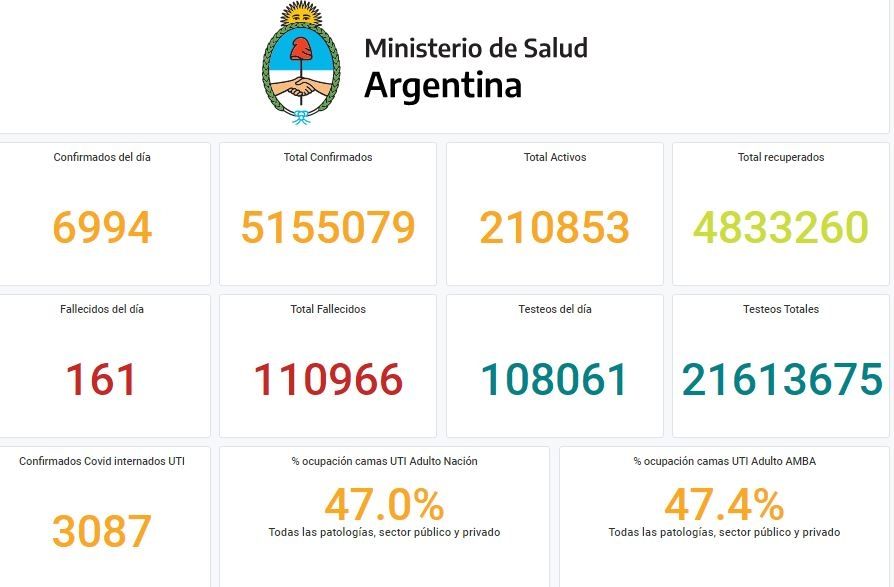 También se informó que fueron realizados 108.061 testeos y desde el inicio del brote se acumularon 21.613.675 pruebas diagnósticas para esta enfermedad.